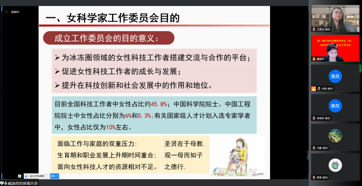 2022年1月13日,中国冰冻圈科学学会(筹)女科学家工作委员会在线开展了“冰天雪地 东西联动”冰冻圈女科学家首次学术沙龙暨第一届中国冰冻圈科学学会(筹)女科学家工作委员会第一次会议。100余名科研人员和学生在线参加了此次活动。