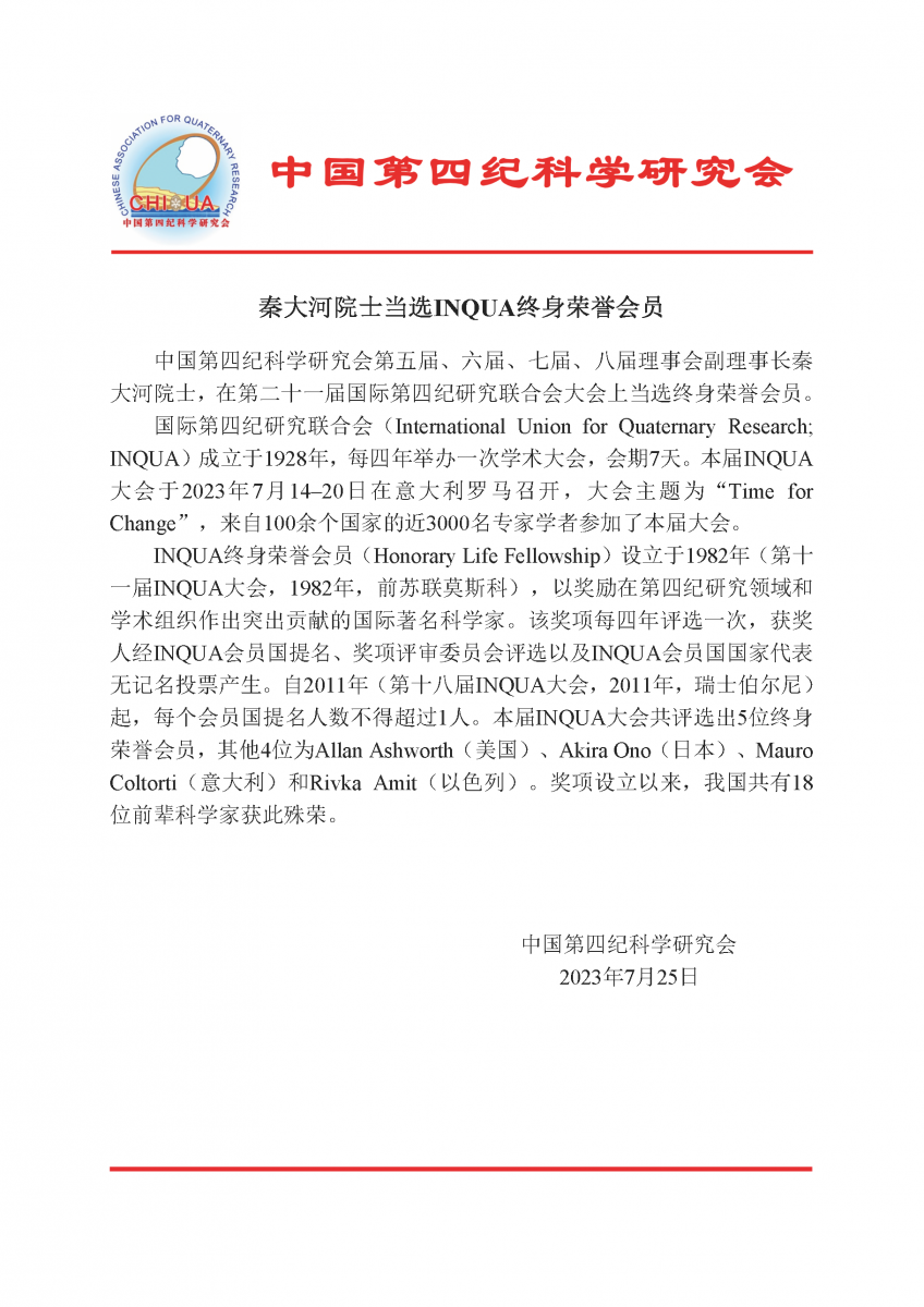 秦大河院士当选INQUA终身荣誉会员