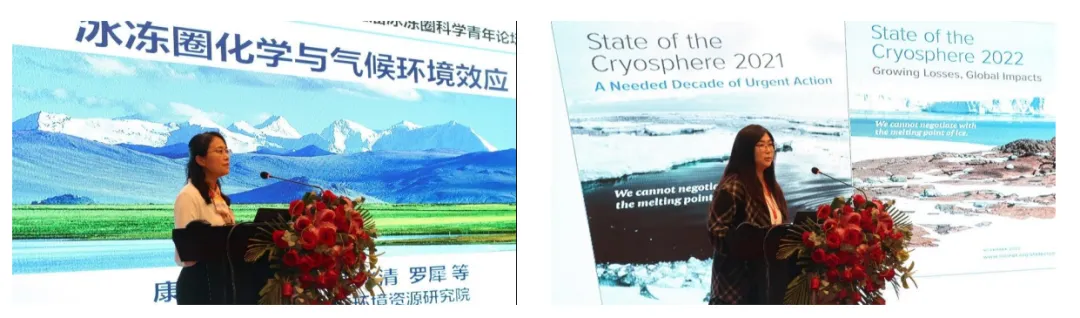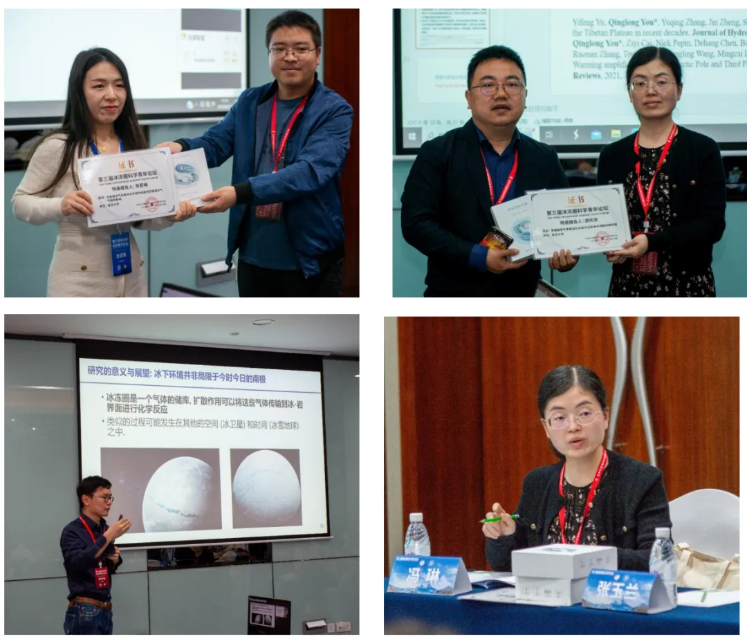 4月14日论坛大会报告上半场,成都理工大学范宣梅教授,北京交通大学李旭教授,中国科学院西北生态环境资源研究院张玉兰研究员,International Cryosphere Climate Initiative 张梦竹中国专员分别作了题为“青藏高原藏东南冰川灾害链动力学机制与风险预测”、“分凝式模型新解”、“冰冻圈化学与气候环境效应”和“国际非政府组织在冰冻圈气候谈判中的参与”的特邀报告,报告环节由张强弓研究员、王天亮教授主持。
