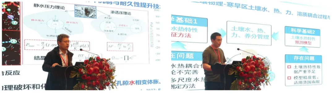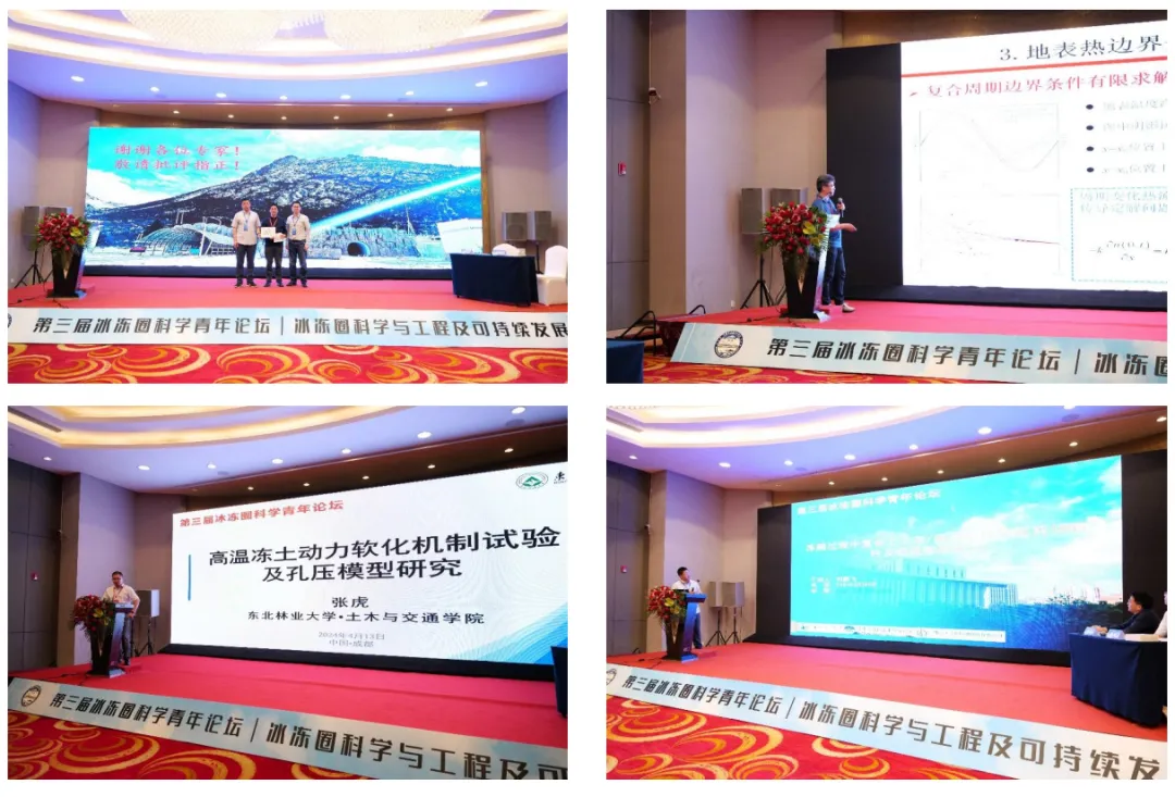 大会报告下半场,中国科学院西北生态环境资源研究院裴万胜研究员,西北农林科技大学何海龙教授,兰州大学曹泊教授,华东师范大学易鑫磊副研究员分别作了题为“冻融环境下混凝土表面超润湿性初步研究”、“土壤导热率模型选择的影响不可忽视”、“青藏高原冰川变化及影响因素研究”和“北极地缘政治的基本矛盾、态势分析与我因应”的特邀报告,报告环节由李栋伟教授、牛贺文研究员主持。