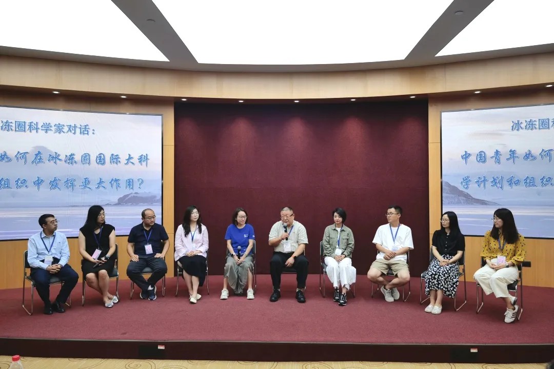 在冰冻圈科学家对话环节,秦为稼一级巡视员、王风平教授、窦挺峰教授、牛贺文研究员、廖丽研究员、同济大学安璐副教授、崂山国家实验室牟龙江副研究员、上海交通大学胡焕婷副研究员、张梦竹博士、虎娇佼理事长围绕“中国青年如何在冰冻圈国际大科学计划和组织中发挥更大的作用”进行热烈讨论。