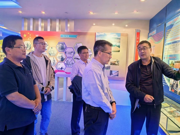 张长春一行参观了沙坡头站科研成果展厅,沙坡头站站长张志山研究员介绍了台站建立与发展历史、自然历史概况、研究方向、不同阶段取得的科研成果及服务国家战略和助力地方经济社会发展等情况。实地调研了全球气候变化观测场、蓝藻培养温室、生物土壤结皮试验区和大型lysimeter群观测平台等试验场地。