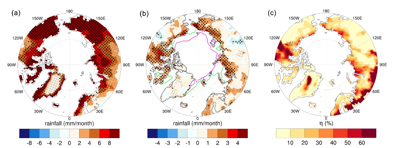 全强迫(a)和仅海冰消融强迫(b)下的北极陆地夏季降雨量的多模式平均响应,(c)海冰消融对降雨变化的贡献率