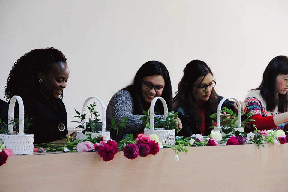 活动中,花艺师细心地为大家讲述每一朵花的名称和特征,以及如何让花儿变美的诀窍:上疏下实,高低错落,虚实相应,千姿百态。女生们认真听取讲解,细心设计自己手中的花篮,一起享受着这暖意的午后时光。