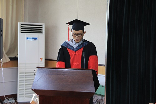 优秀毕业生康建军博士代表毕业生发言。他首先向各位悉心培育学生的导师和西北研究院表示感谢,同时他寄语尚未毕业的师弟师妹们“坚持一下,再坚持一下,也许成功就在不远的前方”,最后表示将铭记母校,以后不管走到哪里,不管在什么样的岗位上工作,都会承担国家、民族和社会赋予的责任。