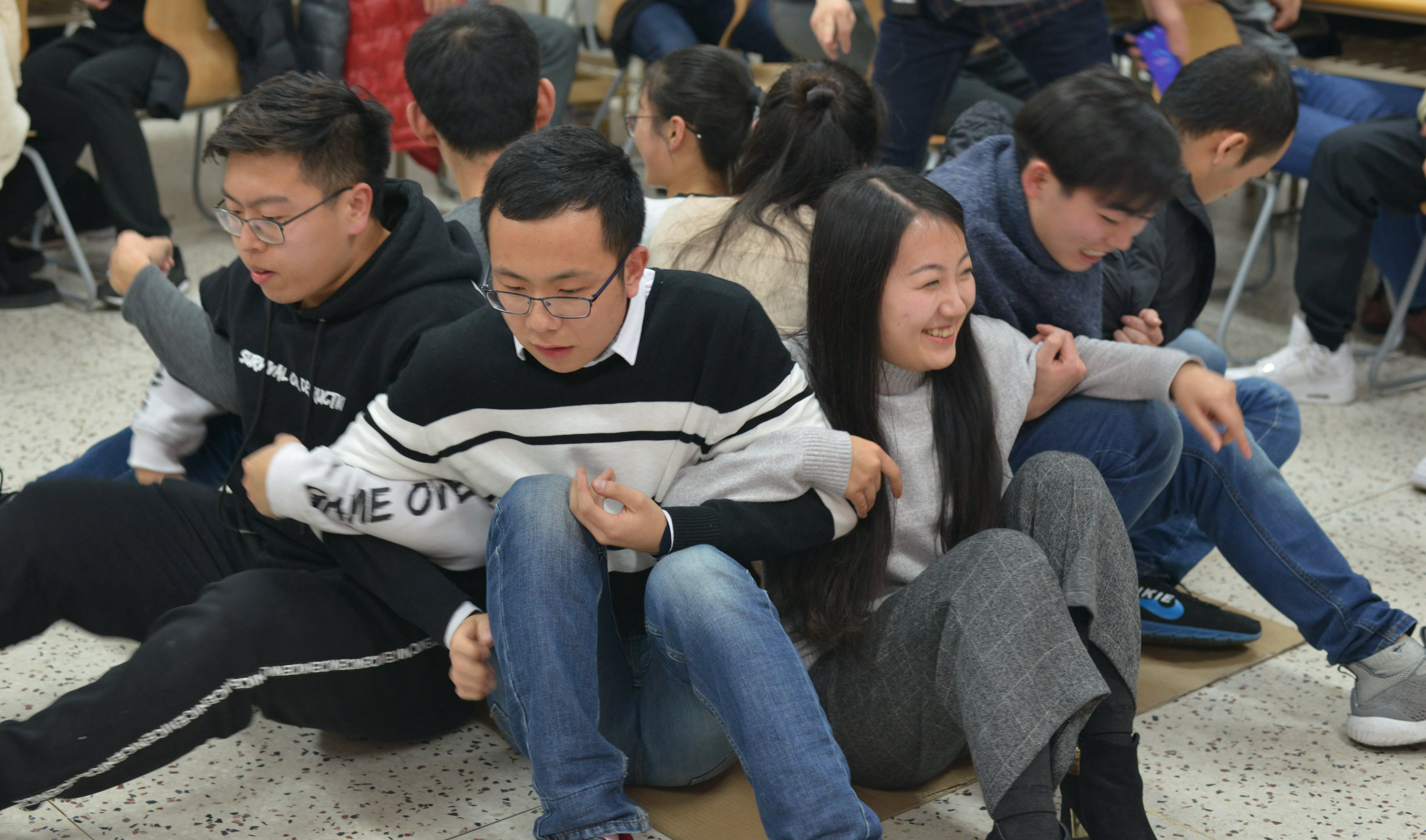 紧接着游戏环节开始。第一个游戏节目是你划我猜,各种幽默风趣的即兴表演,让大家捧腹大笑;第二个节目是坐地起身,坐的意思是屁股贴地,正常来说一个坐在地上的人,是无法手不着物的站起来的,首先四个人背对背手搭桥一同起身,然后逐渐增加人数,规定时间内达到人数最多的小组获胜。这个游戏重在考验团队协作精神,也使晚会又掀起一波小高潮。第三个节目是七拼八凑,主持人当场随机说出物品名称并逐渐加快速度,最先收集齐物品的小组获胜,大家手忙脚乱,收集物品,好不开心。随后又展开“瞎子背瘸子”,“农药对抗赛”,狼人杀等游戏,晚会小高潮接连不断,农药对抗赛进行了大屏幕直播并配有解说,让大家都能看的津津有味。