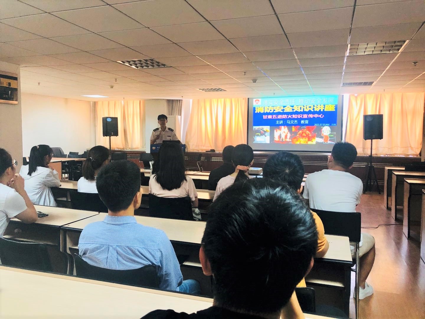 为进一步加强学校安全工作,增强西北研究院研究生消防安全意识,有效提高自救防范能力,做到发生火警火灾时及时、有序地自救互救,确保生命安全,让每一位研究生都能彻底掌握消防器材的功能和使用,提升在处理突发事件过程的应变能力和自我防护能力,7月1日上午,西北研究院研究生部组织开展了以“落实安全责任,推动安全发展”为专题的消防安全知识培训讲座及消防演练。特别邀请了甘肃省五进防火知识宣传中心的马教官进行授课。