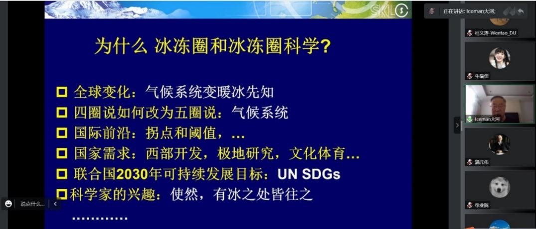 10月22日上午,由秦大河院士领衔授课的《冰冻圈科学概论》如期进行。该门课程2017年获得中国科学院教育教学成果奖,2020年,秦大河院士主编的课程教材《冰冻圈科学概论(修订版)》荣获中国科学院大学优秀教材一等奖,2021年,秦大河院士主编的课程教材《冰冻圈科学概论(修订版)》荣获全国优秀教材特等奖。与往年一样,秦大河院士为学生讲授了第一堂课,讲解了冰冻圈与冰冻圈科学的基本概念、学科发展,冰冻圈与全球气候变化、人类社会与经济发展以及地缘政治等方面的关系,并就IPCC AR6的动向及其与冰冻圈科学相关问题给予了关注。课堂上,秦大河院士还测试了同学们的英语听力与翻译水平,并引导研究生针对新媒体相关报道中的谬误展开了热烈讨论,鼓励同学们要有具备独立思考的能力,并不断提高英语的使用技能,以达到能够规范、正确地传播科学信息的目的。课程内容丰富,气氛活跃,秦大河院士的讲解不仅使同学们对冰冻圈科学与全球变化有了新的认识,也激发了同学们的学习热情。