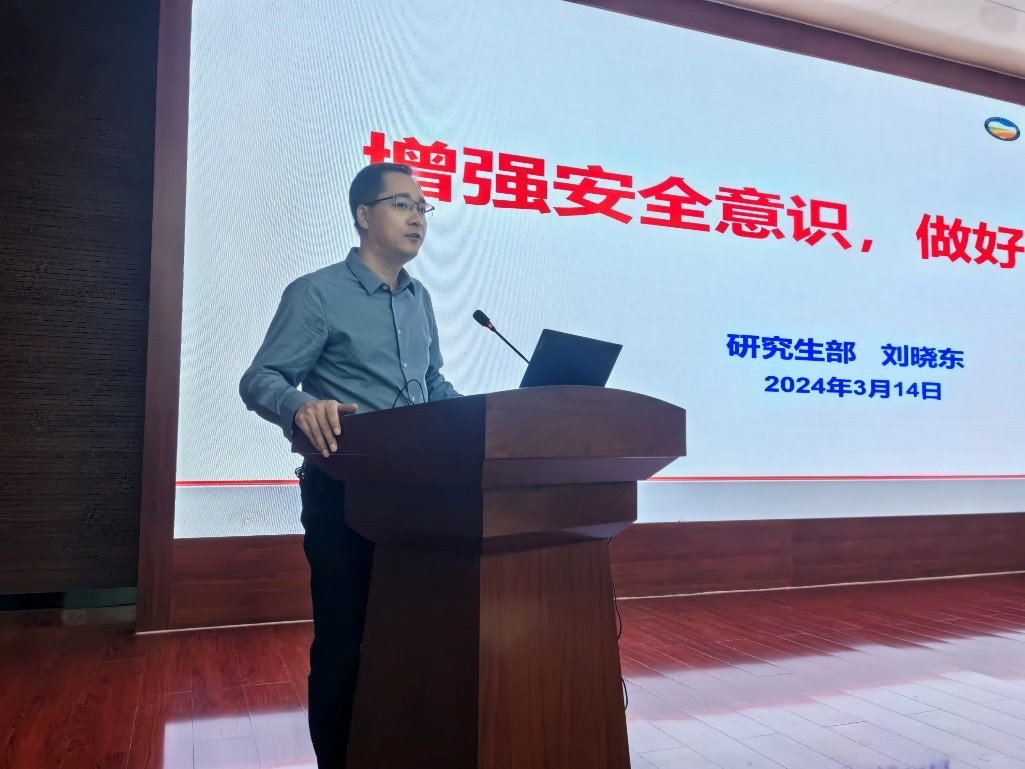 其次,研究生部主任刘晓东做《增强安全意识,做好安全防范》主题报告。他通过对典型安全警示案例的解读,强调研究生在校期间务必注意野外科学考察安全、实验室安全、宿舍安全、交通安全、网络数据信息安全、心理健康管理以及谨防电信诈骗等,掌握必要的安全操作技能和应对突发状况的能力。提醒同学们提高安全意识和自我防范能力,严格遵守相关管理规定。