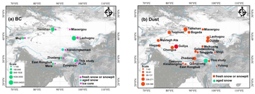 青藏高原冰川中吸光性杂质的分布: 黑碳(ng g-1)(左)和粉尘(µg g-1)