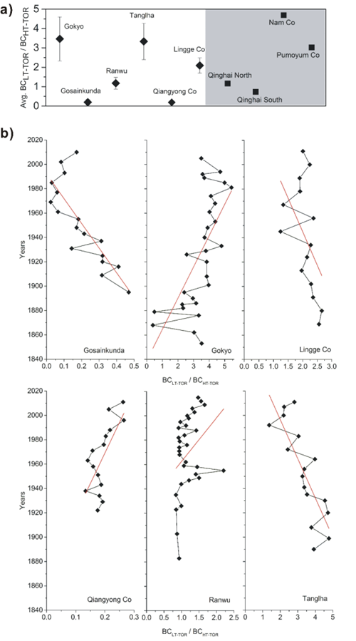 图 3. 不同湖泊沉积物中BCLT-TOR/BCHT-TOR 比值 (a) 及变化趋势(b)