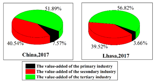 与2001-2005年的观测数据对比显示,拉萨市SO2、NO2、PM10浓度水平过去近20年处于持续稳定状态。分析指出,在经济水平和人口不断增长的背景下,拉萨市独特的地理位置、第三产业为主的产业结构(图4)、水能为主的能源结构(图5)、各级政府部门切实有效的大气污染治理防治措施(包括改造小型燃煤锅炉、控制餐饮油烟排放、淘汰黄牌车不达标车、推广新能源车和公共交通、推广集中供暖等)是拉萨市空气质量良好的原因。拉萨市形成了经济发展和空气质量稳定良好共赢的“拉萨模式”,是我国各大城市开展大气污染物防治,打赢“蓝天保卫战”的典型正面案例。