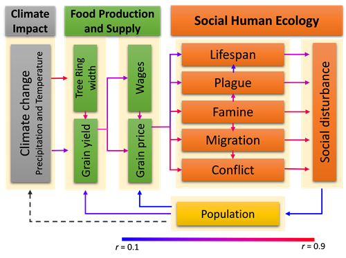 河西走廊气候与人类社会因果关系反映的气候变化多米诺效应概念模型。实线表示因果关系,实线的颜色表示相关系数,虚线表示潜在的当前反馈。