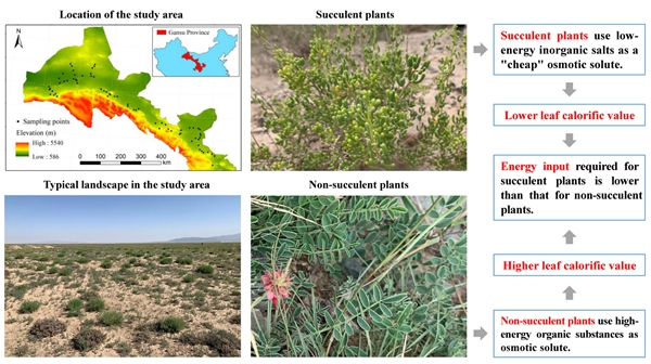 热值(Calorific value)是衡量物质能量水平的度量指标。作为第一性生产者,植物热值是研究生态系统能量过程的重要参数。叶片是植物光合作用的活动中心,相比于其他植物器官,叶片热值能够更好地反映植物对光能的转化能力以及环境因子对植物的影响,是评价植物资源利用特征的综合性指标。长期以来,有关植物叶片热值的研究主要集中在森林生态系统,研究对象大多以能源植物为主。我国西北干旱区分布着丰富的荒漠植被,包括以膜果麻黄为代表的退化叶灌木以及以霸王为代表的肉叶灌木等。然而,我们对这些特色鲜明的荒漠植物的叶片热值特征仍然所知甚少。在荒漠生态系统中开展相关研究,揭示荒漠植物叶片热值的内在决定因素和外在环境驱动力不仅是对中国陆生植物热值研究的有益补充,同时也为在生态学研究中更好、更合理地应用热值指标提供思路。