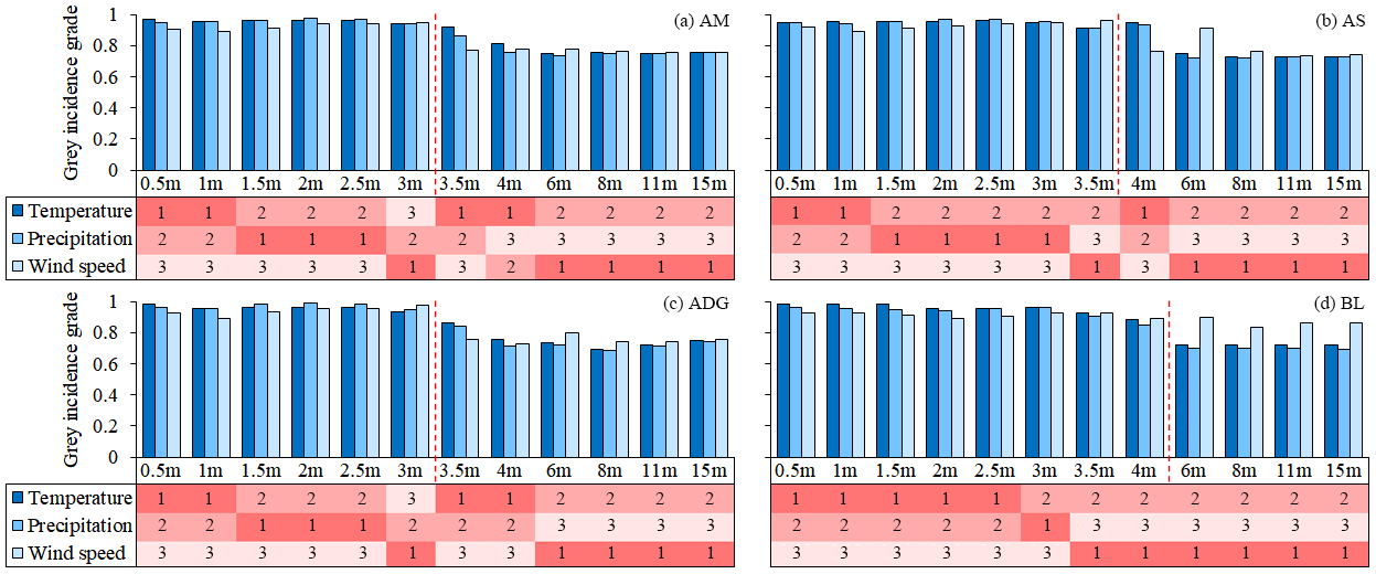 图2 多年冻土温度与气候因子的灰色关联度(直方图)和三种气候因子对多年冻土变化影响的相对重要性排序(表)