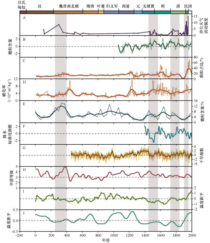 图2 敦煌历史时期沙尘天气活动强度序列(A),敦德冰芯微粒含量(B),苏干湖沉积物粗粒含量(C),苏干湖沉积物磁化率(D),巴里坤湖沉积物组分含量(E),河西走廊近600年降水序列(F),河西走廊帕尔默干旱度指数(scPDSI)序列(G),黑河流域近2 000年旱涝序列(H),Yang等重建的中国2 000年温度序列(I),Ge等重建的中国2 000年温度序列(J)