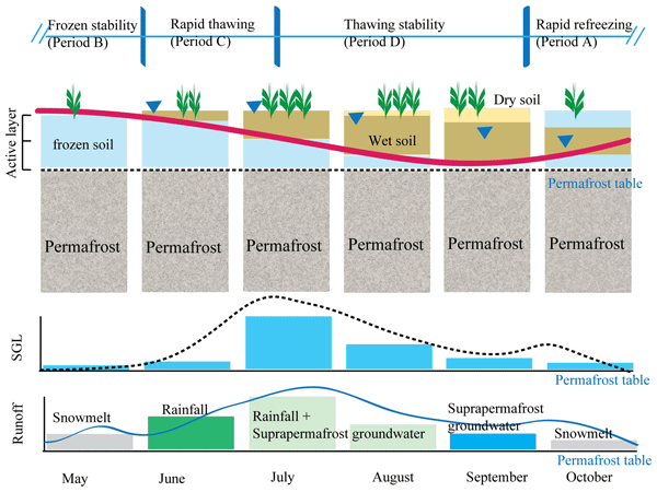 图1. 多年冻土活动层冻融过程“土壤水-冻土层上水-地表径流”动态的响应理论框架