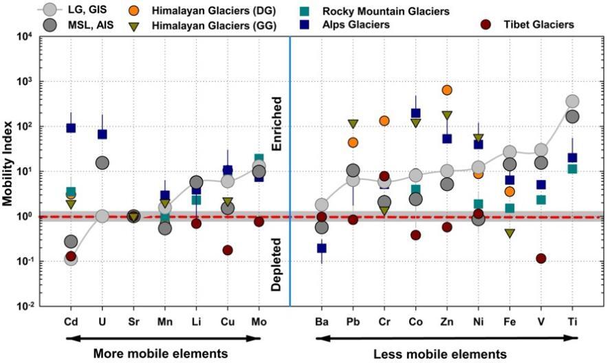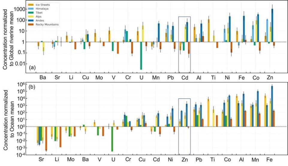 冰川与冰盖融水中痕量金属浓度相对于全球河流和海洋平均浓度的对比