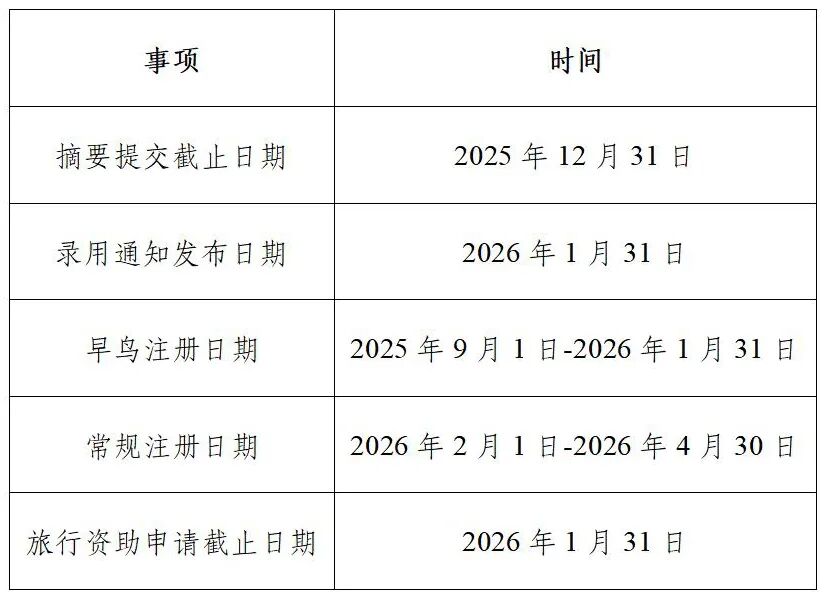 摘要提交存在严格的时间限制,截止日期为2025年12月31日,逾期后系统将关闭提交通道,无法再补充提交。优秀论文遴选工作将于2026年1月30日前完成,届时将从所有合格摘要及展示中选出最多20篇优秀作品,入选作者须在2026年4月1日前提交完整论文。需要特别注意的是,会议不提供任何资金支持,作者参与会议产生的差旅费、住宿费及会议注册费均自行承担,会议亦不设置“演讲者补贴”或相关费用减免。