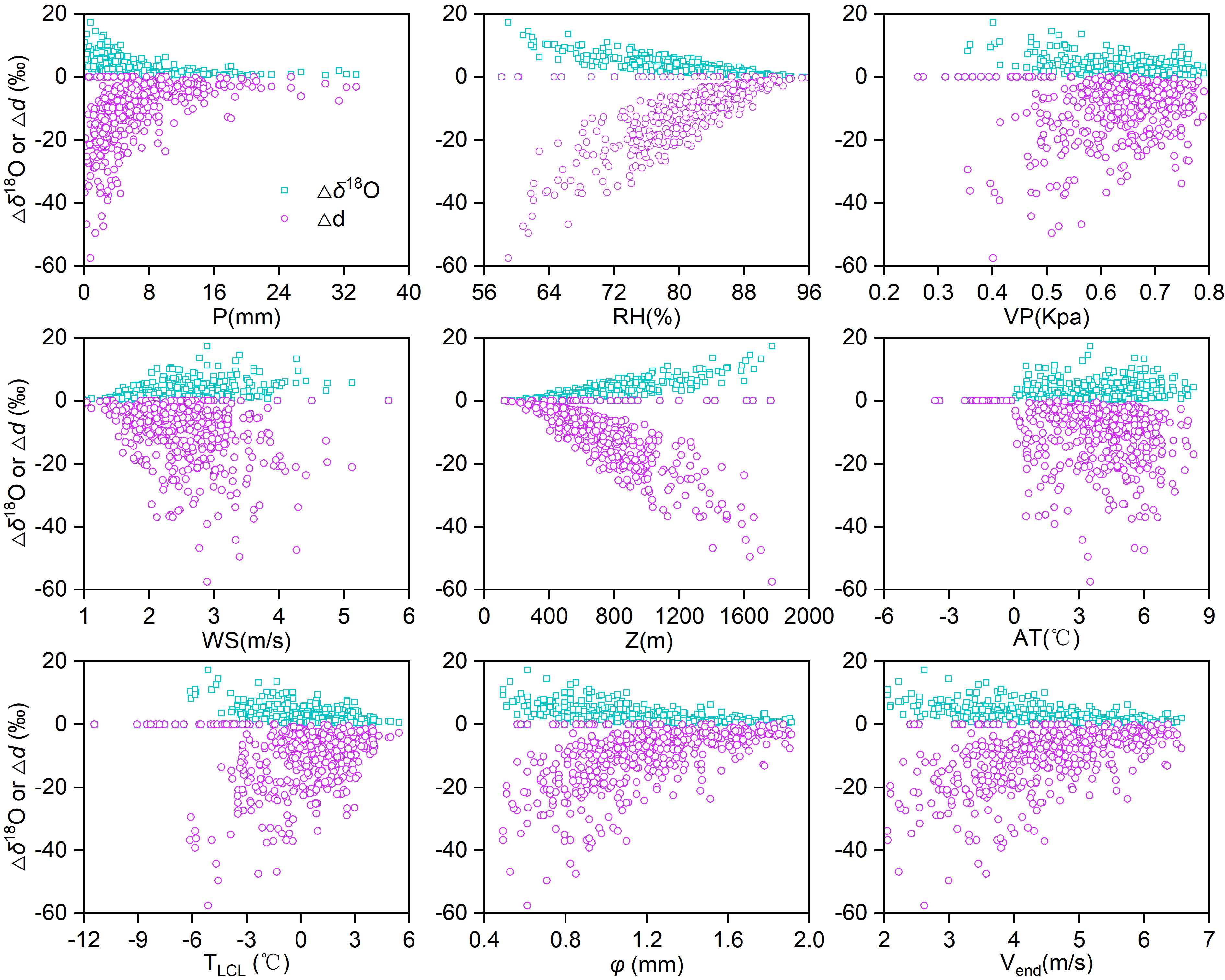 Δδ¹⁸O和Δd与各气象因子的关系
